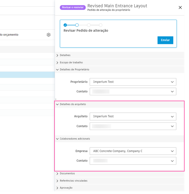 Na seção do menu desdobrável intitulada "Detalhes do arquiteto", os membros podem selecionar o usuário da empresa do arquiteto externo para solicitar a aprovação de COR/OCO.