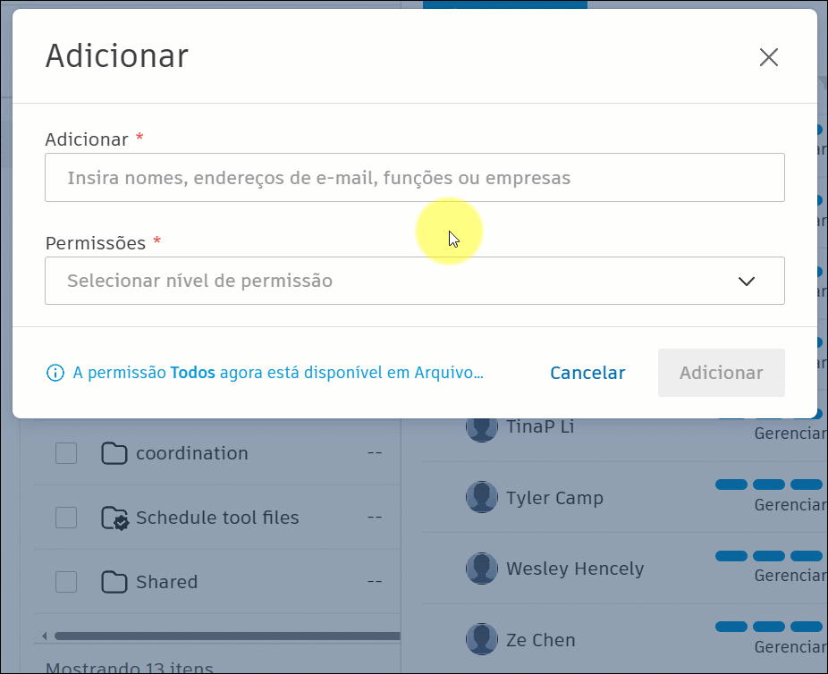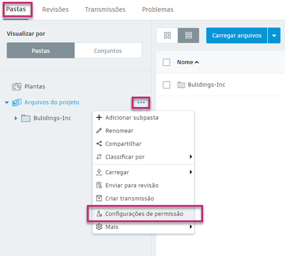 Os níveis de permissão precisam ser definidos para permitir que os colaboradores visualizem, carreguem e baixem arquivos em pastas relevantes. Para fazer isso:
