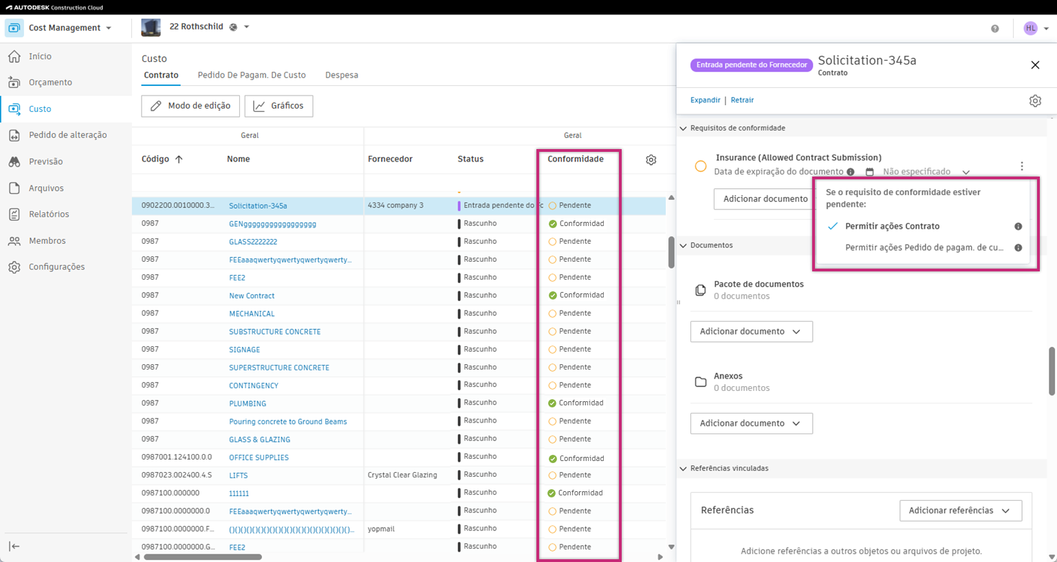 Como administrador de projeto, você pode modificar os requisitos de conformidade para cada contrato e cada pedido de pagamento de custo na seção Requisitos de conformidade no painel Detalhes.