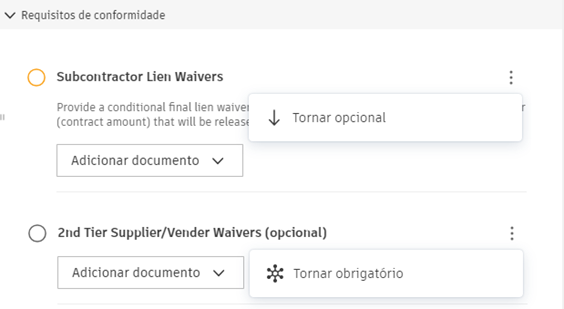 Para fazer isso, consulte a seção Requisitos de Conformidade no painel de detalhes do pedido de pagamento de custo ou item de contrato.