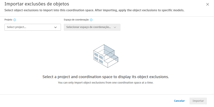 Na caixa de diálogo Importar exclusões de objetos, é preciso escolher um projeto e um espaço de coordenação dentro do projeto selecionado.