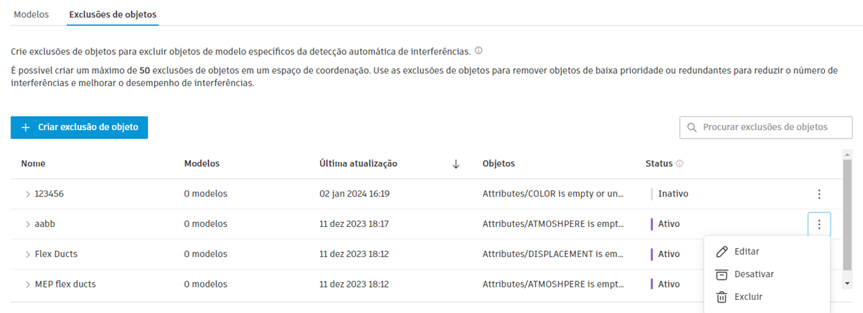 As exclusões de objetos importadas manterão o nome da exclusão de objetos, as regras e ficarão automaticamente Ativas. No entanto, as exclusões de objetos não terão modelos adicionados e, portanto, não afetarão a verificação de interferência.