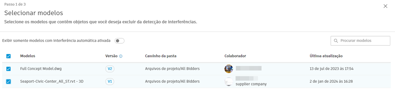 Selecione os modelos cujos objetos você deseja excluir da interferência.