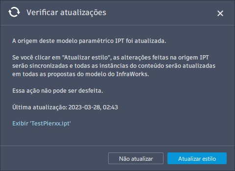 Verificar atualizações permite fazer alterações nos arquivos de origem do modelo paramétrico (no Inventor ou no Revit) e, em seguida, aplicar essas alterações ao estilo de modelo paramétrico na paleta Estilos, bem como todas as instâncias daquele estilo usadas no modelo. |