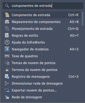 | Agora é possível usar a Pesquisa de comando para pesquisar comandos no InfraWorks, em vez de precisar **clicar** em vários menus da barra de ferramentas. |