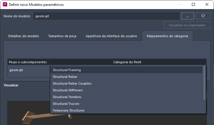 Mapeie as categorias do Revit para o conteúdo paramétrico com base no Inventor.