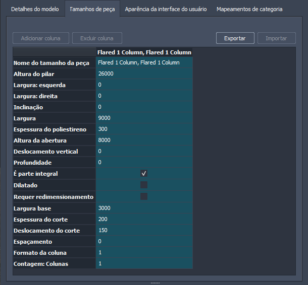 Adicionar ou excluir colunas: Para criar novas variações de tamanho de peça, clique no botão Adicionar coluna. Cada coluna representa um novo tamanho de peça. Clique duas vezes em um valor em uma linha da coluna de tamanho de peça selecionada e insira os novos valores para modificar o tamanho da peça. Clique em uma coluna e, em seguida, clique no botão Excluir coluna para remover a coluna de tamanho de peça selecionada.