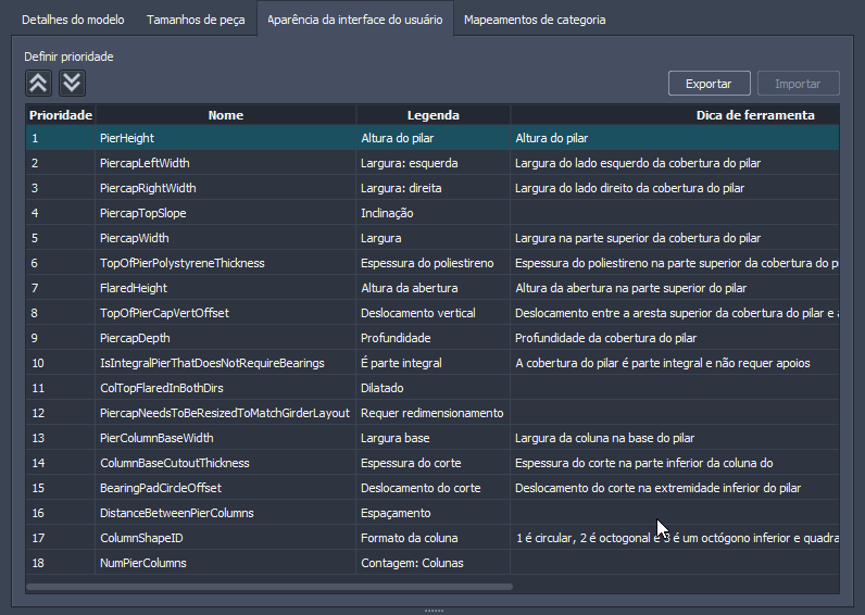 Aparência da interface do usuário: ao adicionar ou modificar componentes de ponte paramétricos, segmentos de túnel ou acabamentos de estrada na guia Modelos paramétricos da paleta Estilos, você pode usar a guia Aparência da interface do usuário, localizada na caixa de diálogo Configurar modelos paramétricos, para personalizar o modo como os atributos dos componentes paramétricos serão exibidos na Pilha.