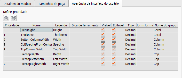 Prioridade: Use as setas para cima e para baixo em Definir prioridade para determinar a classificação descendente das dimensões principais que são exibidas como atributos para o componente paramétrico selecionado na Pilha. Normalmente, você usará o campo Prioridade junto com o campo Nome do grupo, de modo que possa classificar os atributos na Pilha para atender às necessidades de seu projeto.