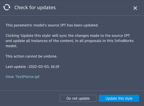 Na parte superior direita da janela de detalhes, clique em Verificar atualizações. O arquivo de origem de estilo será verificado para determinar se ele foi atualizado. Se o arquivo tiver sido atualizado, uma janela será exibida com a opção de atualizar todas as instâncias do estilo usado nas propostas no modelo do InfraWorks.
