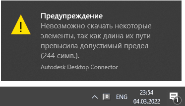 Desktop Connector не поддерживает пути к вспомогательным файлам длиннее 244 символов. Это обусловлено тем, что у корпорации Майкрософт существует ограничение 260 символов для длины пути к файлам и 247 символов — к папкам.