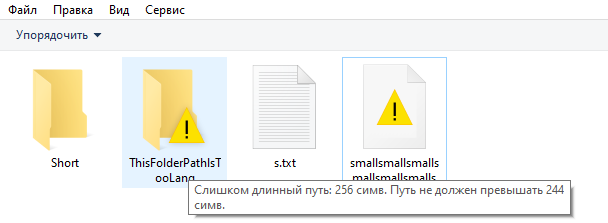 При навигации в проводнике Windows файл или папка помечаются специальным значком, демонстрирующим превышение ограничения длины пути, а также подсказкой с указанием ограничения и текущей длины пути к файлу или папке.