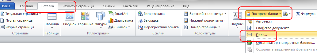 Для вставки нового поля объединения на ленте "Вставка" нажмите "Экспресс-блоки" и выберите "Поле".