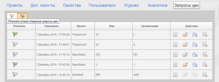 При просмотре в режиме администратора на вкладке "Запросы цен" отображается список запросов цен от ваших клиентов.