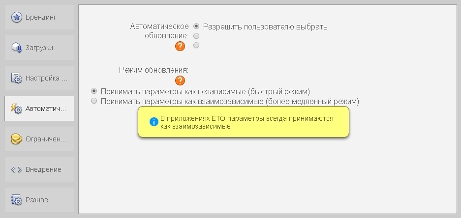 - "Принимать параметры как взаимозависимые (более медленный режим)": при изменении любого параметра, он отправляется на сервер и обновляется на стороне клиента. При этом невозможно изменить несколько параметров одновременно.
