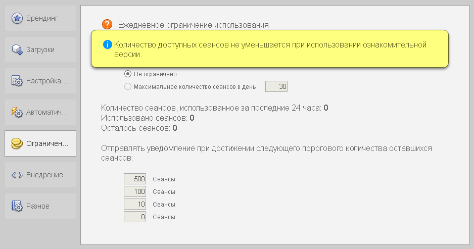 Когда количество оставшихся сеансов заканчивается, пользователям с правами администратора отправляется сообщение по электронной почте. Условия для отправки уведомлений можно настроить в соответствующих полях ограничений.