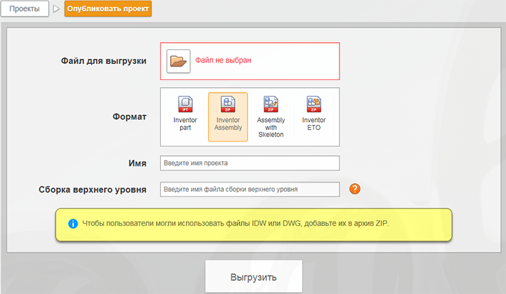 - Выберите сборку Inventor или сборку со скелетом и задайте имя проекта. Имя сборки верхнего уровня должно быть уникальным в архиве ZIP.