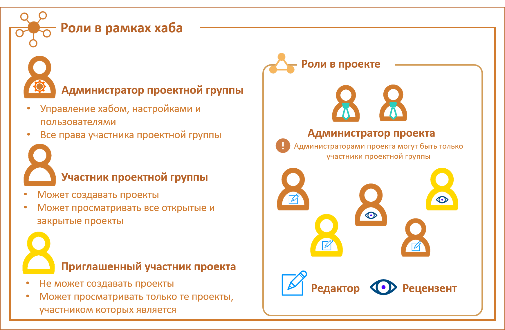 На рисунке ниже представлены общие сведения о ролях в хабе и в проектах. Подробную информацию о каждой роли см. в соответствующих разделах.