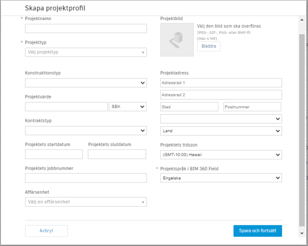 Välj ett språk från BIM 360 Field-listrutan för projektspråk.