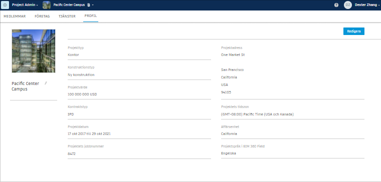 Som kontoadministratör kan du redigera profilinformation, inklusive projektbilden. Du kan även lägga till projektadministratörer till ett tidigare skapat projekt. Din projektprofilinformation används över BIM 360 och i rapporter och statistik. Ditt projektadress används till exempel för att visa projektplatsen på en karta och väderförhållanden på projektets startsida.