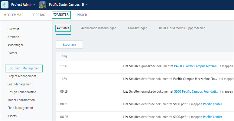 När ändringar görs i dina projekt som använder Document Management modulen, registreras de i aktivitetsloggen. Du kan visa aktiviteten och exportera loggen som ett Excel-kalkylblad baserat på ett markerat datumintervall.