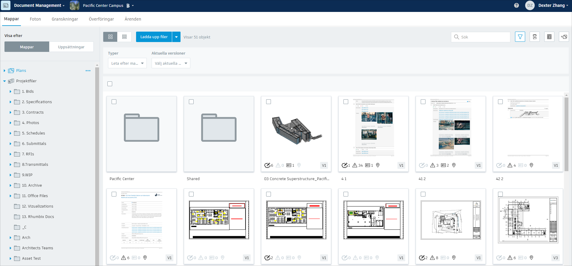 Varje BIM 360 Docs-projekt börjar med förkonfigurerade områden som har ställts in för att stödja en specifik process eller datatyp. Dessa översta arbetsutrymmen ärmappar för Planer och projektfiler.