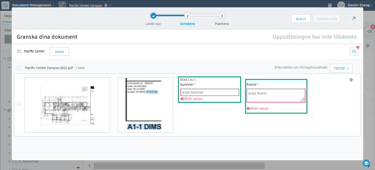 Vid dokumentuppladdning så använder varje ritblad det definierade ritningshuvudet för att extrahera angivna data. Om ett fel uppstår, uppmanas du att granska och rätta till dina dokument, som det visas nedan.