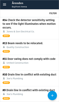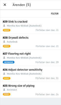 Filtrera ärenden efter typ, undertyp, status, plats, underplats, tilldelad person, grundorsak eller förfallodatum genom att trycka på FILTRERA.