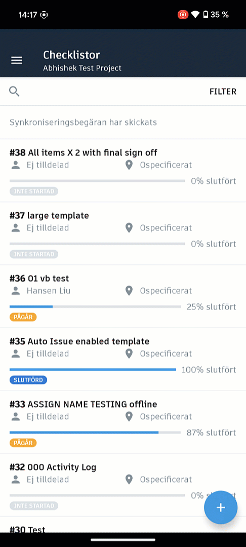 Om din enhet har synkroniserats till projektet med den senaste versionen av checklistemallar så kan du skapa och fylla i checklistor när du är offline.