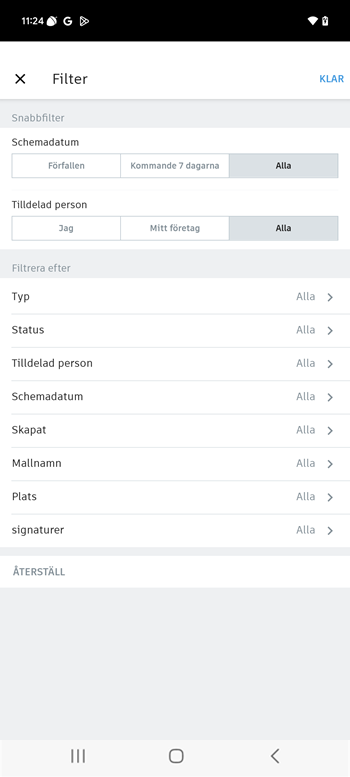 Filter: Du kan filtrera efter typ, mallar, status, plats eller underplats, tilldelad person, schemadatum, signatur eller skapandedatum genom att trycka på Filter