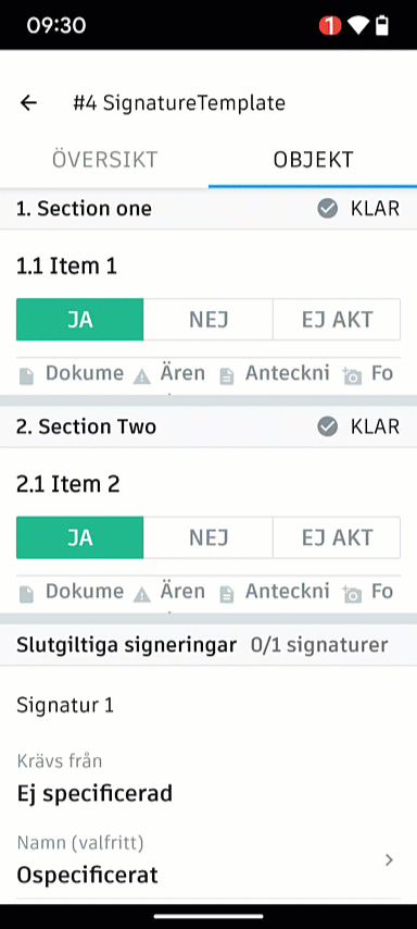 Du kan behöva skicka in din signatur för att slutföra en checklista. I avsnittet Signatur/Slutliga signeringar trycker du på rutan Tryck för att signera och skriver din signatur. Om det behövs, ge enheten till den person vars signatur krävs.