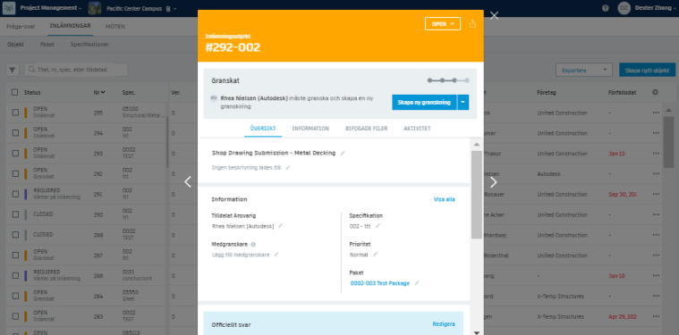 Obs! den ansvarige entreprenören som tilldelats inlämningsobjektet måste vara samma ansvariga entreprenör som har tilldelats paketet.