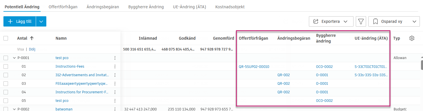 Obs! Medlemmar med samarbetsåtkomst ser inte kolumner med kopplade ändringsbeställningar.