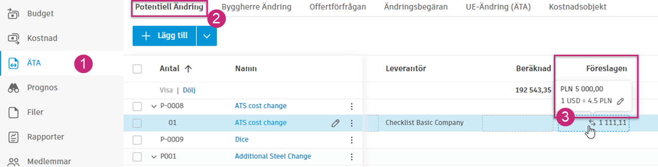 När du genererar ett nytt avtal från en Potentiell Ändring (PCO) eller ett kostnadsobjekt kan du välja valutan, redigera valutakursen och kopiera värdet från kolumnen Uppskattat. Ikonen visar det konverterade värdet.