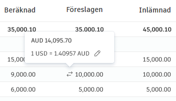 Värdena Uppskattat, Inskickat och Godkänt kommer alltid att anges i basvalutan. Ändå kommer du att se förändringar i de Föreslagna och Utfästa värdena. Basvalutan visas med ikonen bredvid sig. Hovra över den för att se eller redigera valutakursen: