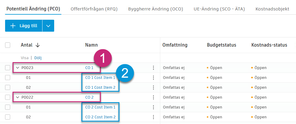 Potentiella ändringar (ÄTA) är utgångspunkten för alla budget- och kostnadsändringar. Från en Potentiell Ändring (PCO) kan du även skapa andra ändringsbeställningar. Länka kostnadsobjekt för att skapa en koppling tillbaka till den påverkade budgeten, avtalet och leverantören. Kostnadsobjekt kan dock även skapas direkt i fliken Kostnadsobjekt och tilldelas till en Potentiell Ändring (PCO) senare.
