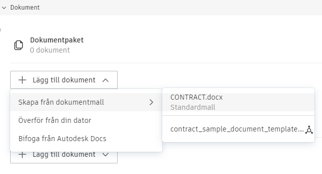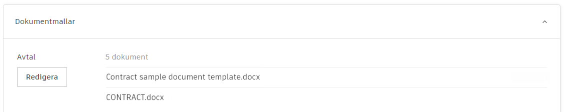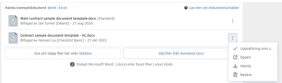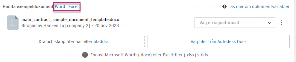 Välj Hämta exempeldokument om du vill hämta en anpassningsbar Word- eller Excel-mall. Arbeta från en Microsoft Word- eller Excel-fil och lägg till nödvändiga variabler. Lär dig mer om variablerna som finns tillgängliga för dokument.