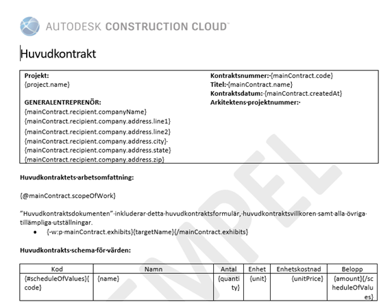 Du kan anpassa den hämtade mallen efter företagets behov. Innehållet inom parenteserna måste dock förbli detsamma för att modulen ska känna igen och fylla i det automatiskt när dokumentet skapas. Läs mer om variabler.