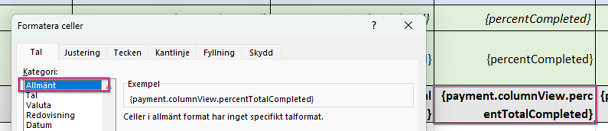 Om du vill ange procentvärden i kolumnen procent i Excel-mallen formaterar du cellerna som Allmänt. Under importen till Cost Management så tolkas värdet automatiskt av mallen som en procentsats (exempelvis kan du använda 12.39 för 12.39%).