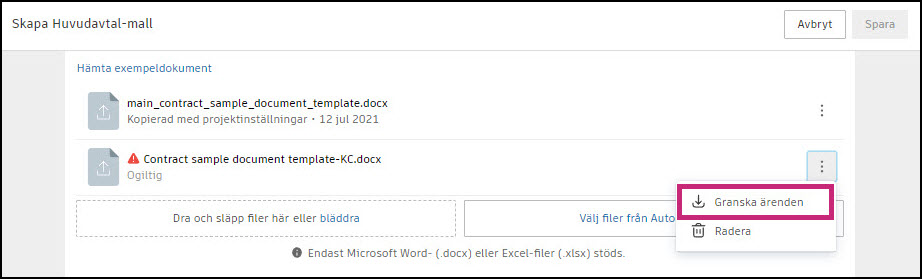 När du skapar dokumentmallar kan du hämta och redigera en exempeldokumentmall. Du gör det genom att välja Word eller Excel för att hämta en anpassningsbar Word- eller Excel-fil.