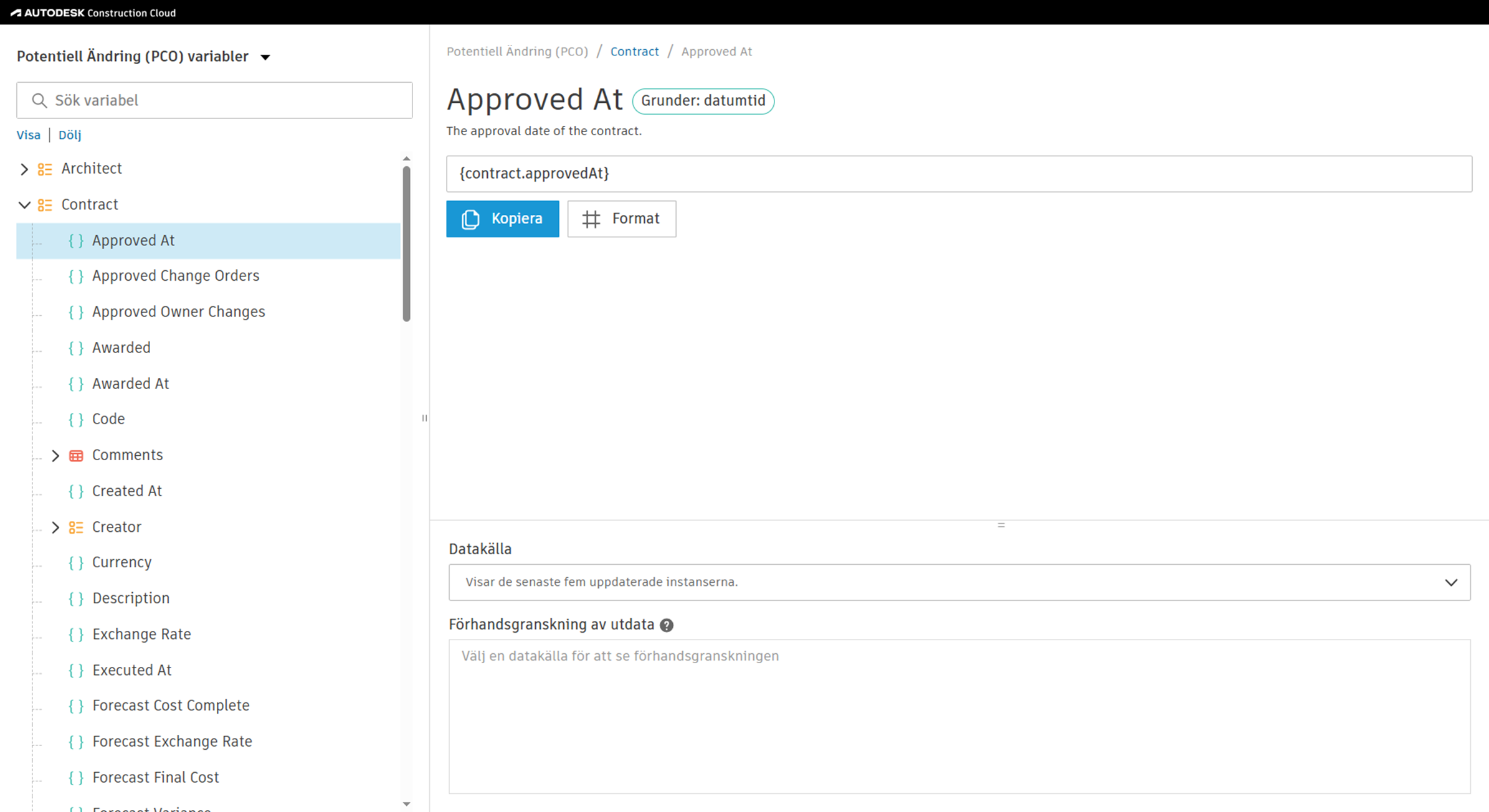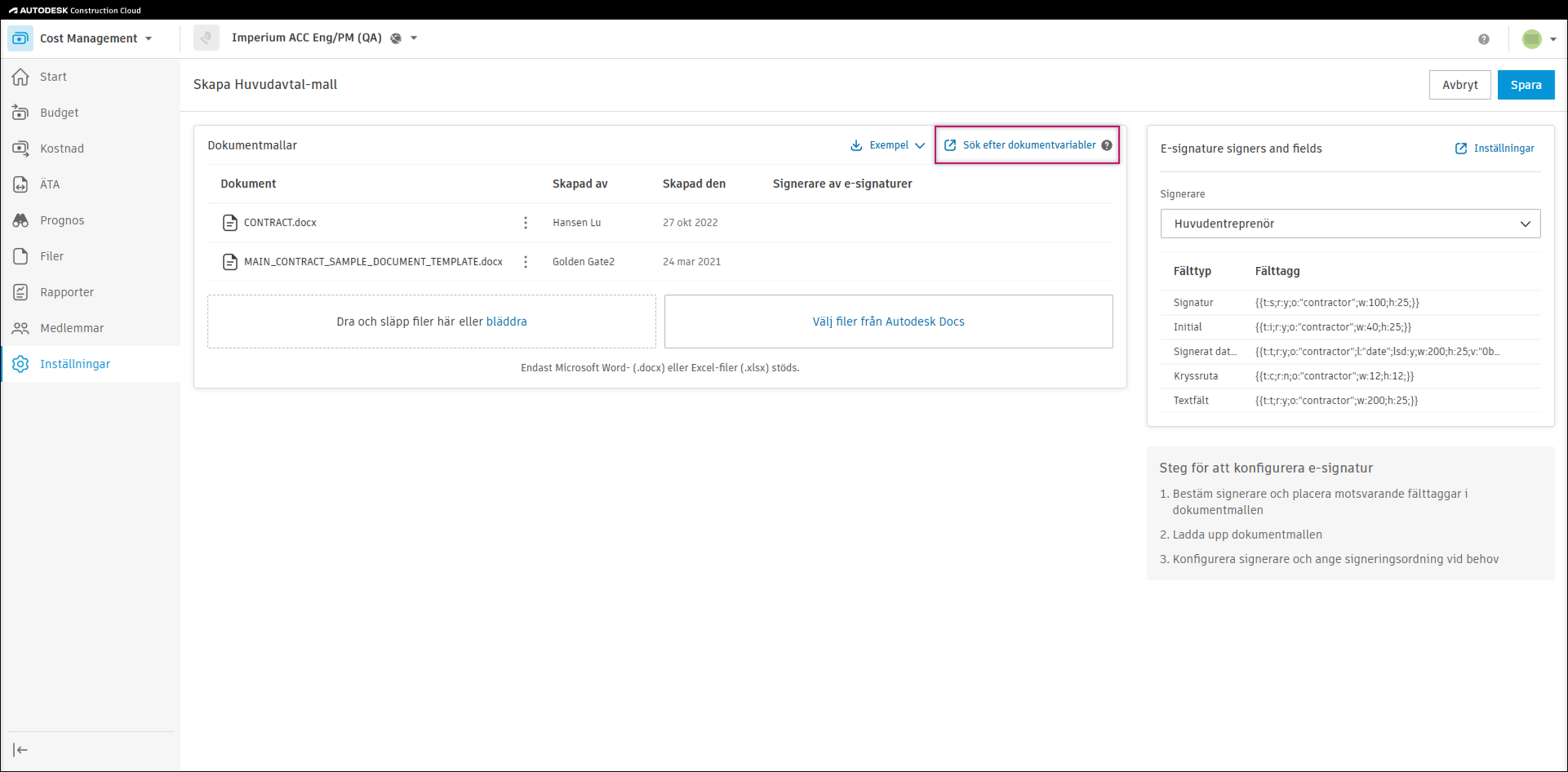 Dokumentmallar använder variabler för att hämta data från Cost Management. Projektadministratörer definierar dokumentmallarna och kan använda dessa variabler för att automatiskt hämta data då dokumentet genereras. Det här gör att du slipper manuell datainmatning i formulär och fält i dokument.