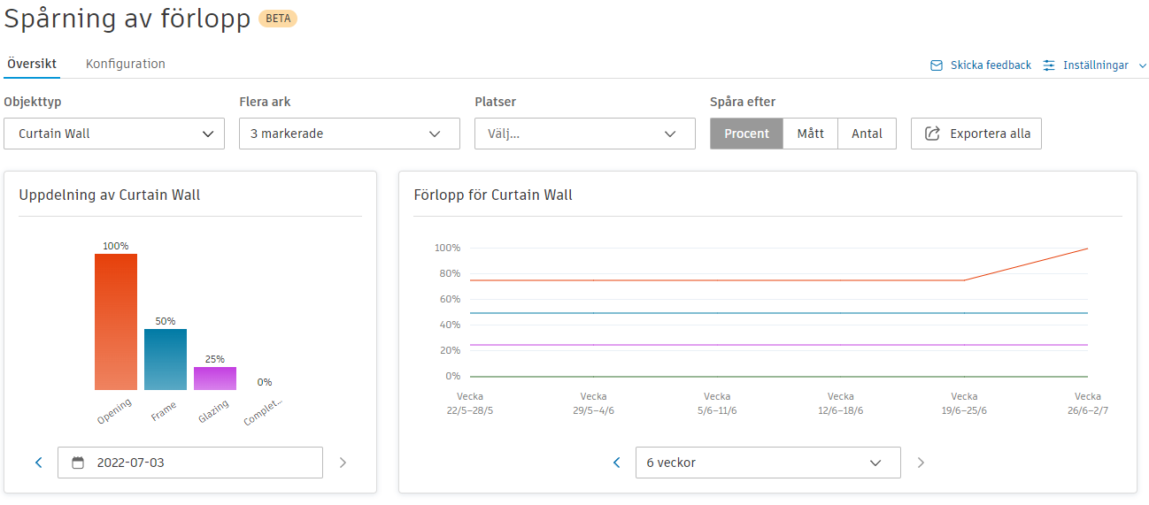 Du kan spåra installationsförloppet i procent, mått eller antal objekt. Det gör att du kan justera scheman dynamiskt och ge korrekta förloppsuppdateringar till alla som arbetar med projektet.
