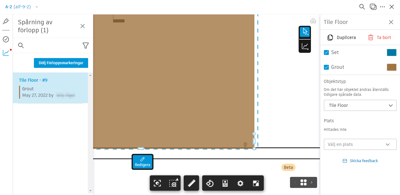Om du vill använda Förloppsspårning konfigurerar du först objekttyper i verktyget Förloppsspårning. När du har konfigurerat dem kan du spåra objekt med markeringsfunktionen i verktyget Ritningar.