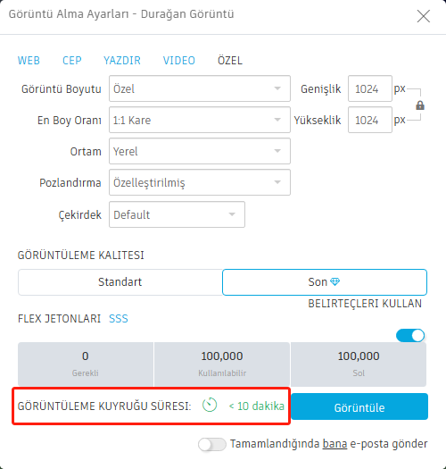 Güneş enerjisi görüntülemeleri yüksek sunucu gücü gerektirdiğinden görüntüleme işlemi daha uzun sürer. Bu tür görüntülemelerde kare sayısını azaltarak kuyruk süresini kısaltın.