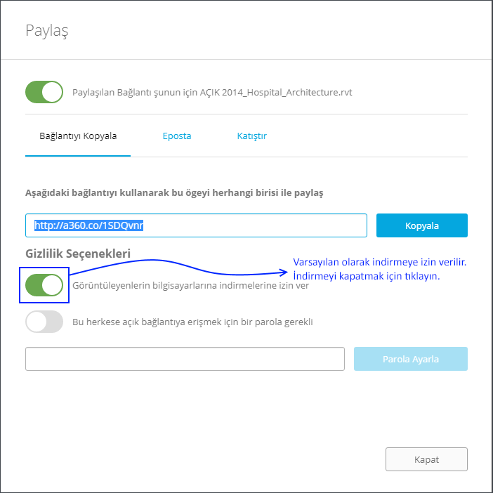 Varsayılan olarak, paylaşılan bağlantılar için İndir seçeneği açık durumdadır. Bu özelliği kapatabilirsiniz. Ayrıca dosya için bir parola belirleyebilirsiniz.