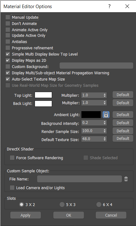 - Applies the current settings, except for changes to the Slots group, without leaving the Material Editor Options dialog. This is useful when you adjust lighting values for the sample slots.