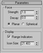 When on, and when the Decay value is greater than 0.0, icons in the viewports indicate the range at which the force of gravity is half the maximum value. For the Planar option, the indicators are two planes; for use the Spherical option, the indicator is a double-hooped sphere.