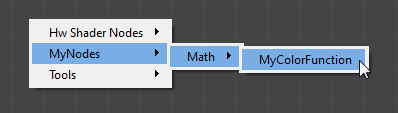 Your group node, now renamed to Name, is now accessible when you right-click the work area. It appears on the right-click menu as Category nameSub menu name