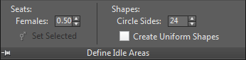 Modify panel. To change the gender distribution of selected seats, set the Females ratio value on the Define Idle Areas expansion panel (see below), then click Set Selected. A red or blue marker on each seat indicates the gender and facing direction of its sitter.
