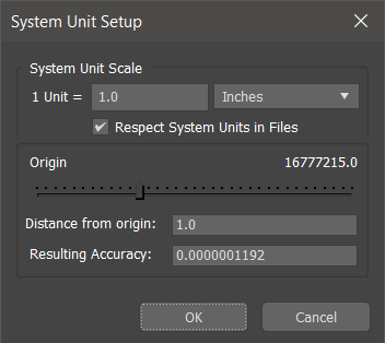 These controls provide a system unit calculator to help you determine the unit scale for your project. The resolution of measurement diminishes as the distance to the origin of space increases, so you need to consider space granularity when you choose a scale for your project. If you're modeling an island, for example, this calculator can help you determine the smallest object you should model on the island. In other words, don't use a unit scale of millimeters if you plan on modeling an island that's many miles across.